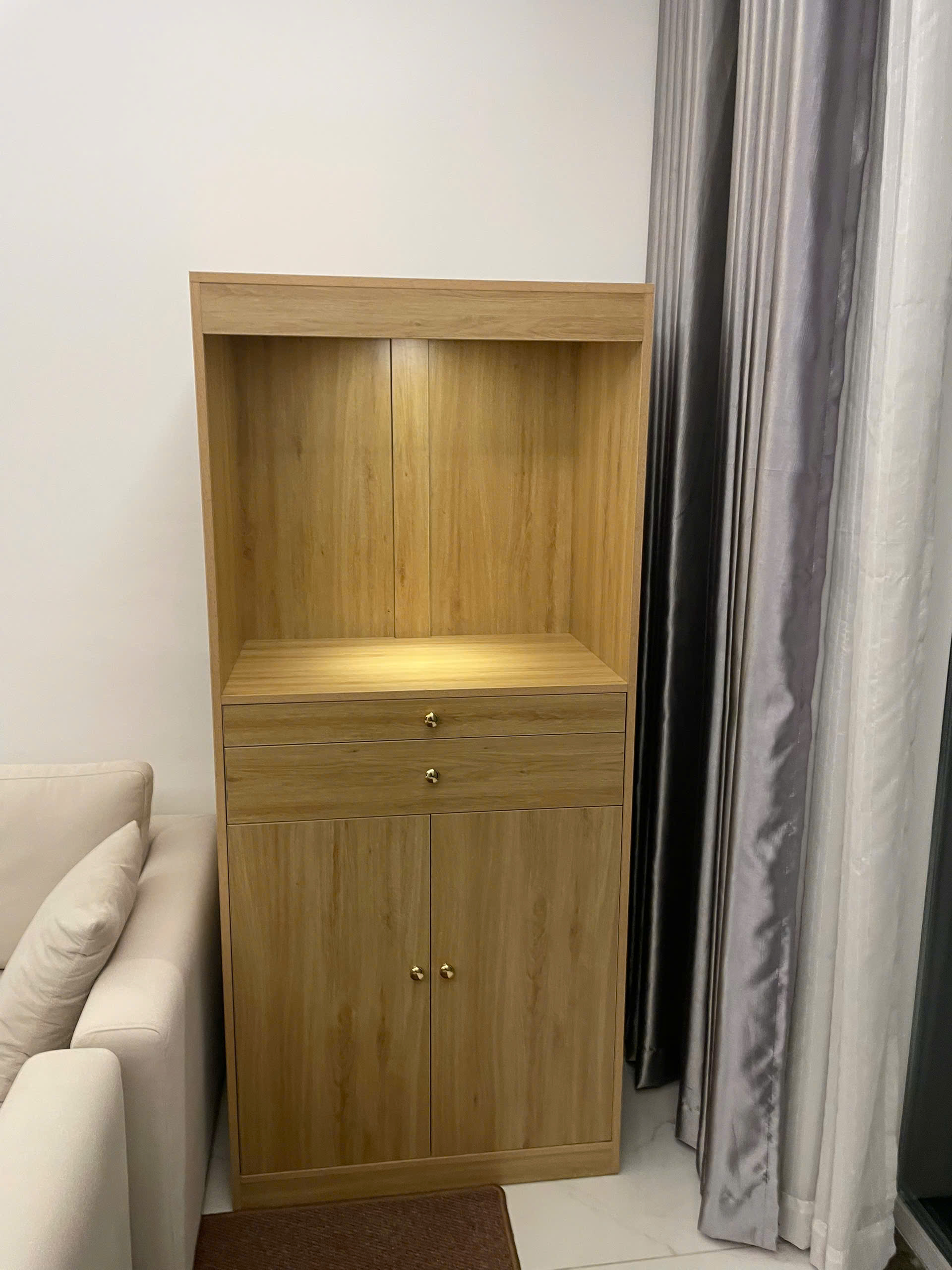Chiếc tủ thờ còn được chia làm 2 phần chính: Phần trên là nơi để tượng phật, phần dưới là chỗ cho ngăn kéo và tủ đựng đồ