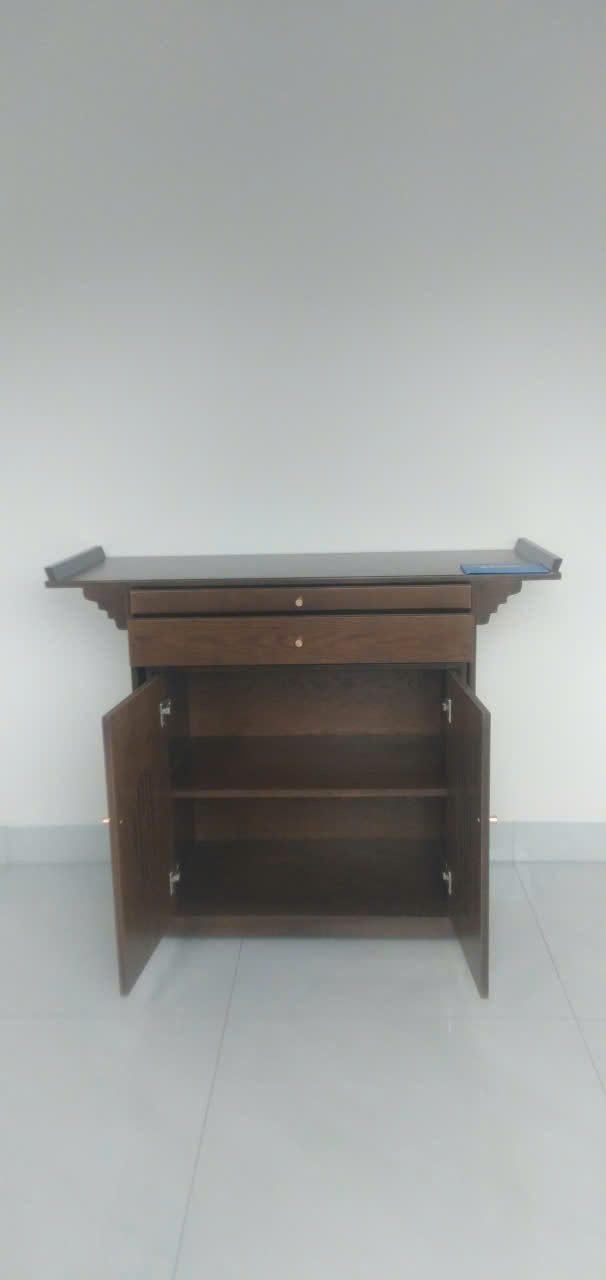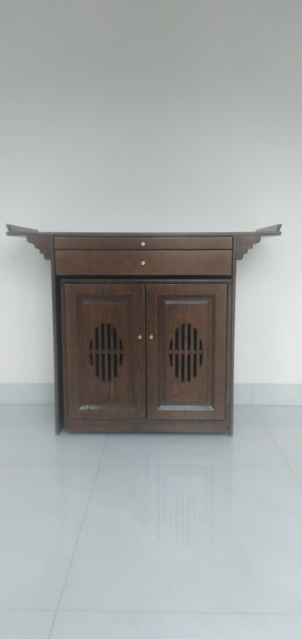 Một trong những đặc điểm độc đáo của mẫu này chính là sự kết hợp tinh tế giữa bàn thờ và tủ thờ nhỏ. Với thiết kế thông minh, sản phẩm này không chỉ là nơi để thờ cúng mà còn có thể lưu trữ các vật dụng linh thiêng một cách gọn gàng và tiện lợi.