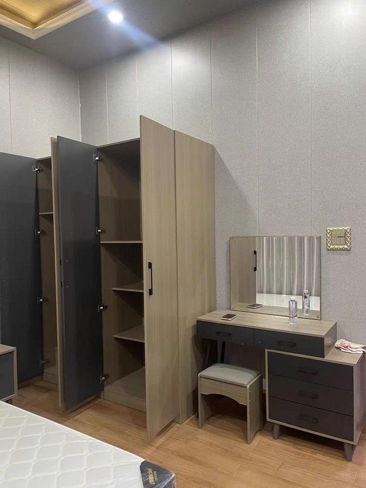 Mẫu nội thất gỗ công nghiệp cho phòng ngủ GHS-9418 được thiết kế theo phong cách hiện đại – sang trọng, mang đến không gian nghỉ ngơi tiện nghi và thẩm mỹ. Bộ sản phẩm gồm giường ngủ, tủ áo lớn và bàn trang điểm, tất cả được đồng bộ về màu sắc, chất liệu và phong cách, phù hợp với chung cư, nhà phố và các không gian cần sự tinh tế, gọn gàng.