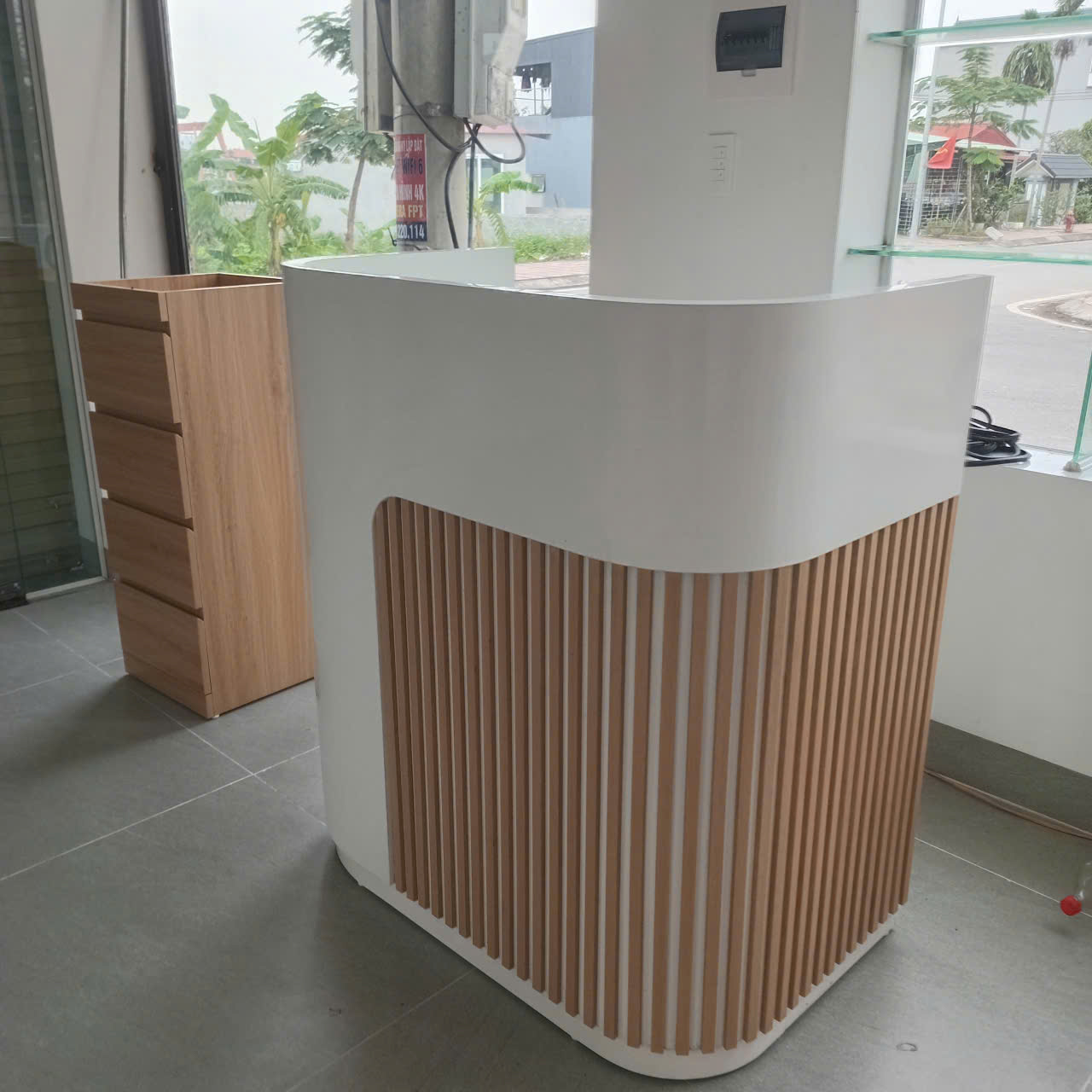 Mặt sau quầy lễ tân nhỏ gọn thiết kế với không gian lưu trữu đa dạng dành cho nhiều loại đồ dùng khác nhau giúp tối ưu hóa không gian sử dụng. Thiết kế thanh chắn cao phân chia hai khu vực làm việc và khu vực tiếng tân – thanh toán giúp tạo diện mạo gọn gàng, chuyên nghiệp hơn cho cửa hàng.