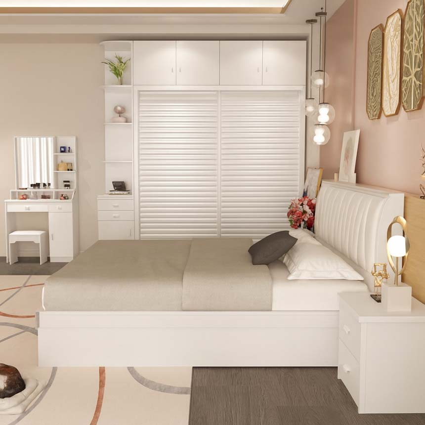 Mẫu tủ quần áo có kệ trang trí GHS-55102 là lựa chọn hoàn hảo cho phòng ngủ hiện đại nhờ thiết kế thông minh kết hợp giường, tủ áo và bàn trang điểm đồng bộ. Chất liệu gỗ MDF cốt chống ẩm phủ melamine, cánh sơn bệt cao cấp cùng đầu giường bọc da/nỉ sang trọng mang đến tổng thể tinh tế, tiện nghi và cực kỳ thẩm mỹ.