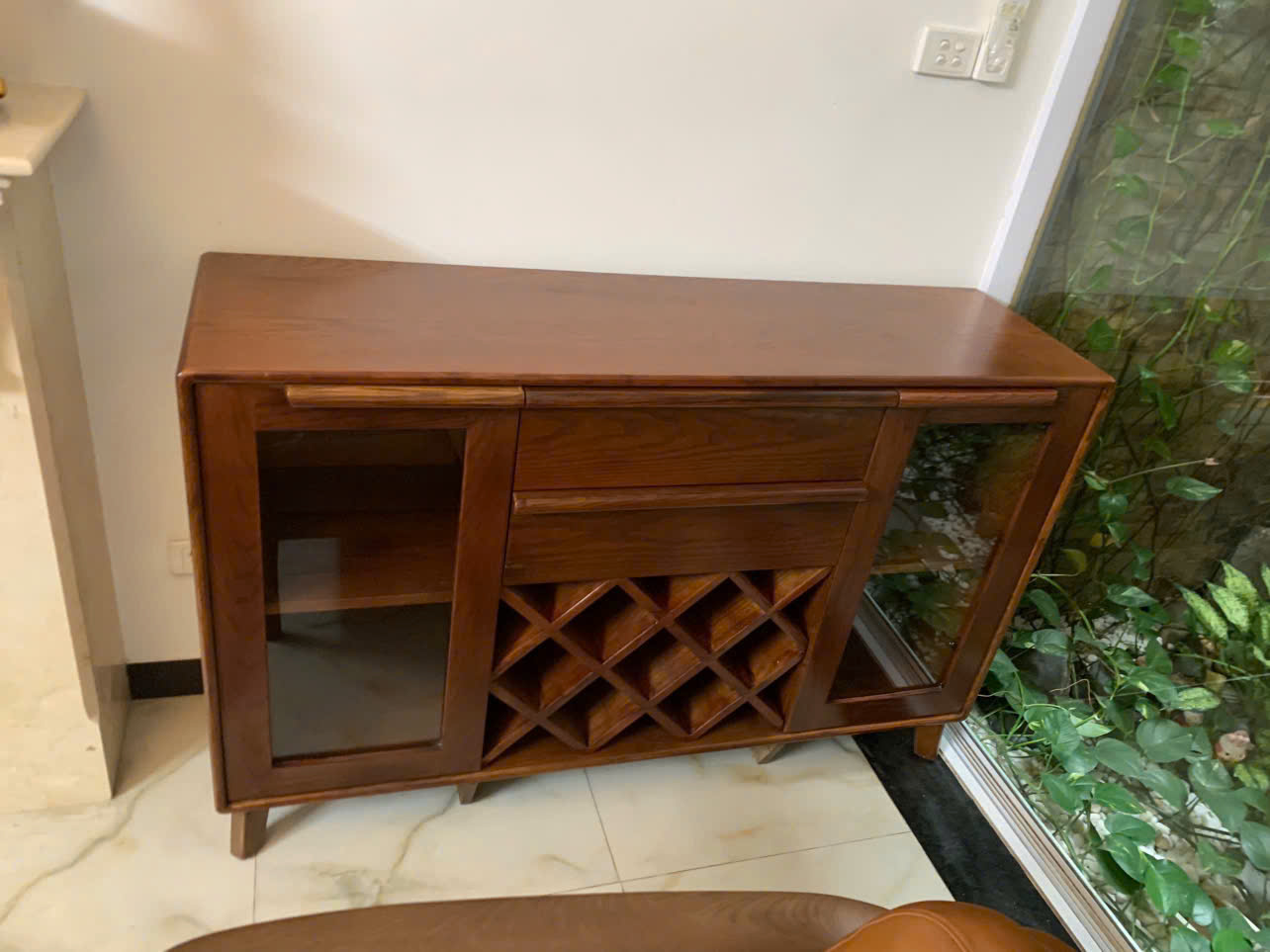 Tủ có ngăn chia ô vuông nhỏ để đựng những chai rượu truyền thống có kiểu dáng thon dài. Hai bên của tủ được thiết kế kiểu tủ kính để những chai rượu có kiểu dáng to và cũng là nơi để đựng những dụng cụ, ly, chén,…